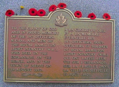 To the glory of God and in proud memory of the 197 officers, N.C.O.s , and men of the Royal Hamilton Light Infantry (W.R.), who died on the esplanade, on the beach, and in the town of Dieppe on 19 August 1942. |