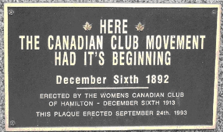 Here the Canadian Club MovementHad It’s Beginning December Sixth 1892 Erected by the Womens Canadian Club of Hamilton December Sixth 1913 This Plaque Erected September 24th, 1993