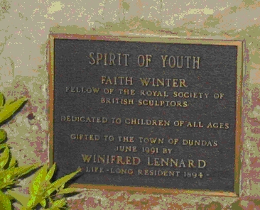 Spirit of Youth Faith Winter Fellow of the Royal Society of British Sculptors Dedicated to children of all ages Gifted to the Town of Dundas June 1991 by Winifred Lennard A life-long resident 1894-